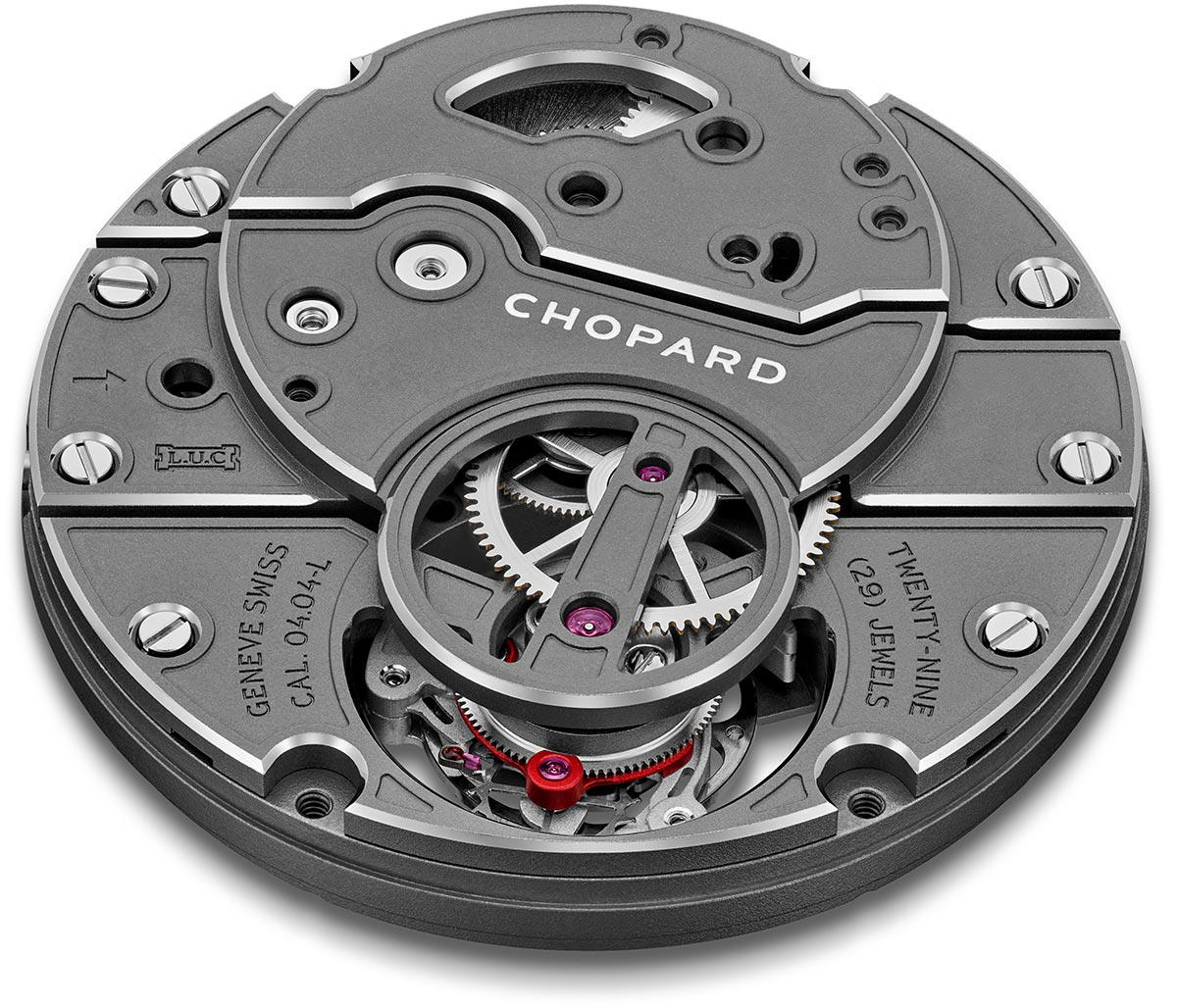 Au cœur de la pièce, le calibre L.U.C 04.04-L ne se dissimule pas. Il est suspendu et intégré à l’architecture même de la montre, à la manière d’un moteur dans un châssis spaceframe.